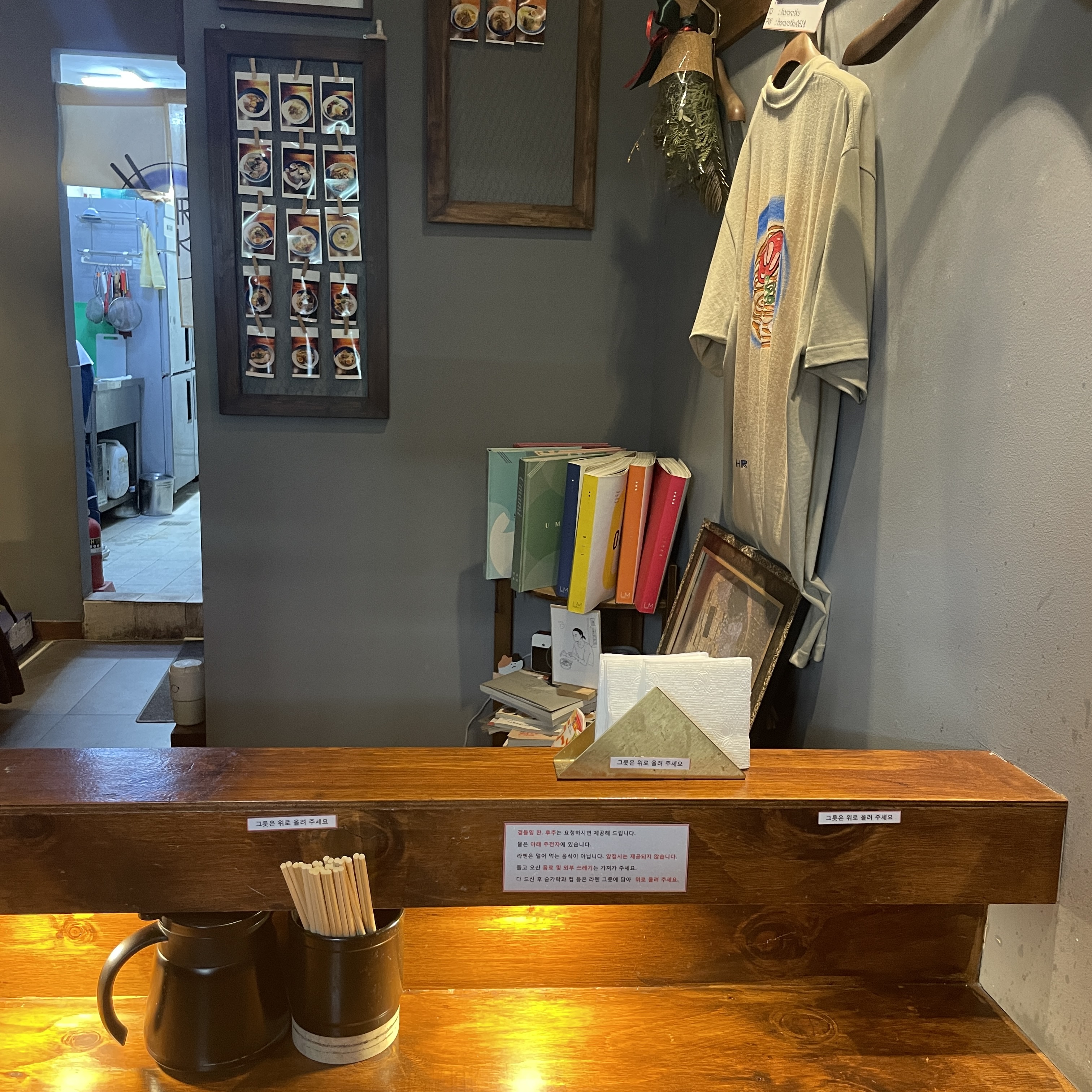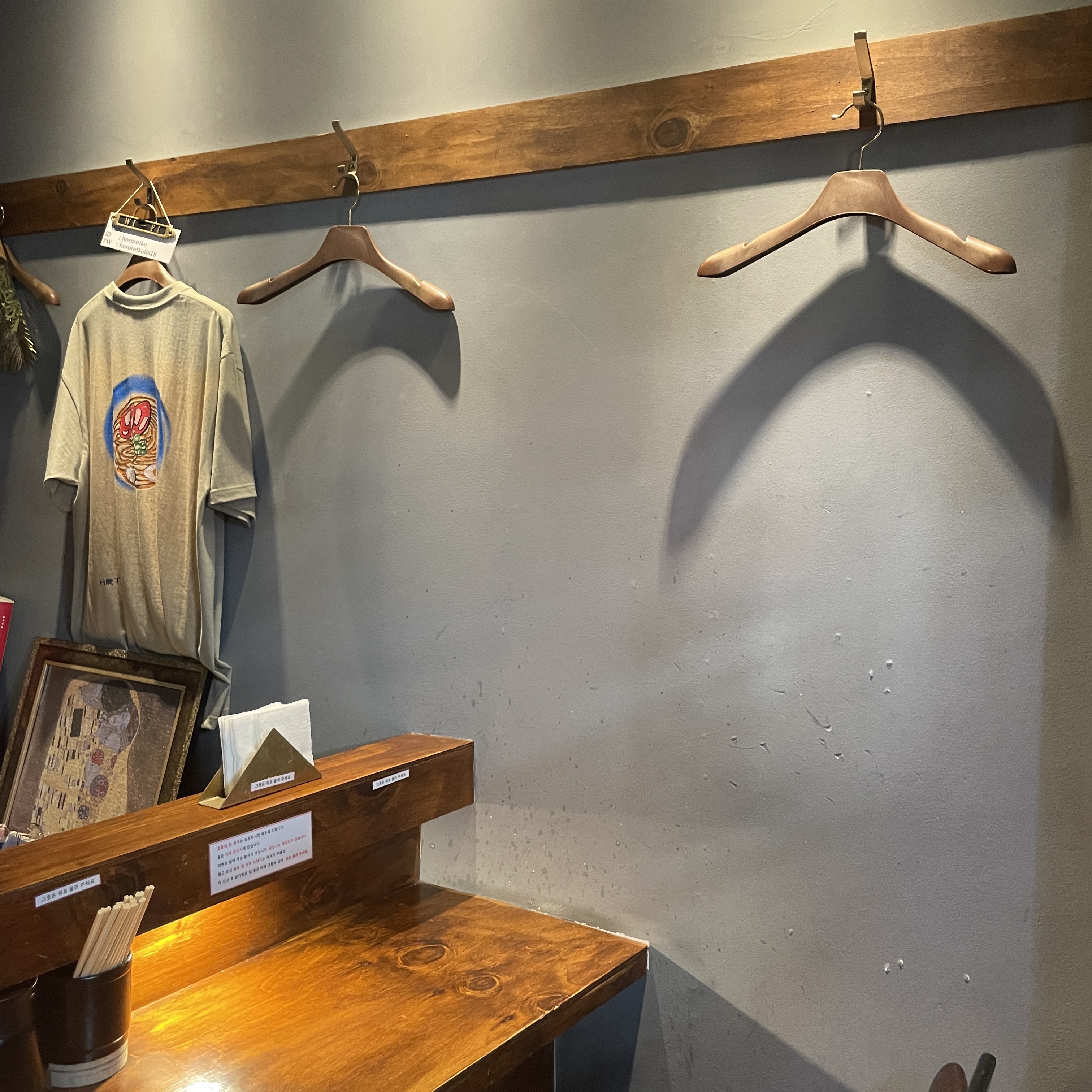 어느 라멘집과 같이 벽에는 옷을 걸 수 있는 옷걸이가 있어요