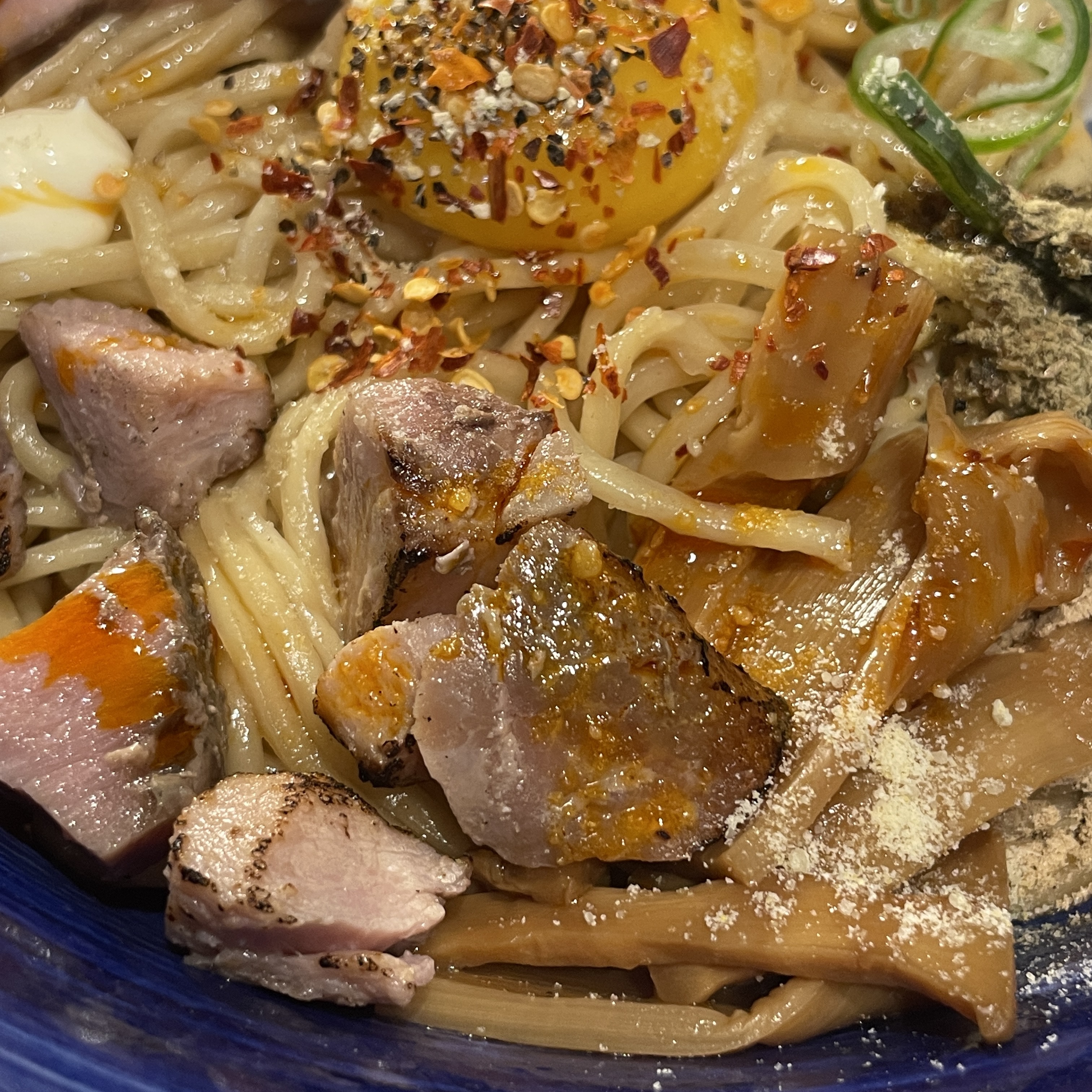 아부라비빔소바 위에는 매콤한 고추 후레이크가 뿌려져 있어요