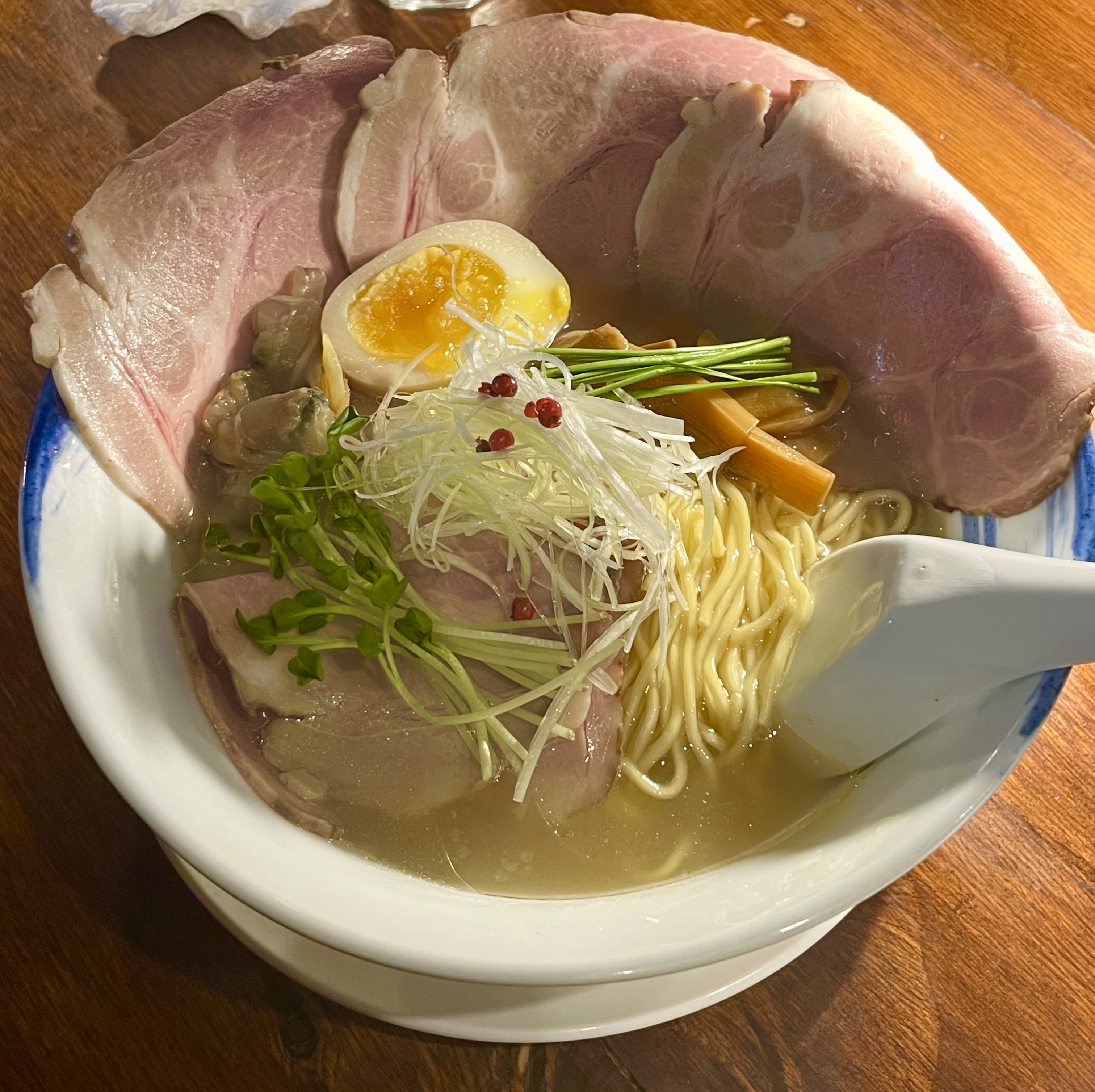 닭, 해산물, 조개 육수에 소금으로 간을 한 시원 깔끔 그 자체인 라멘.