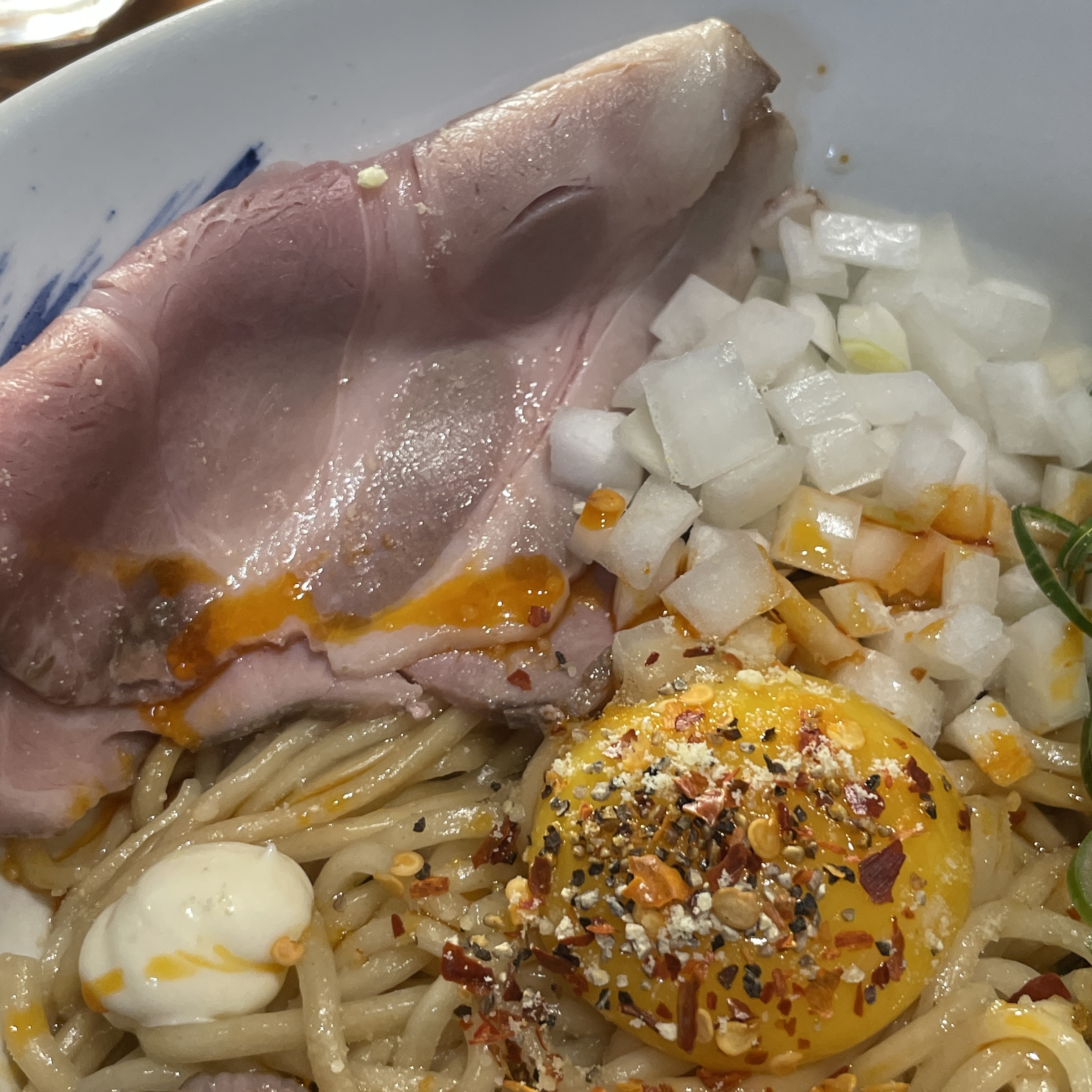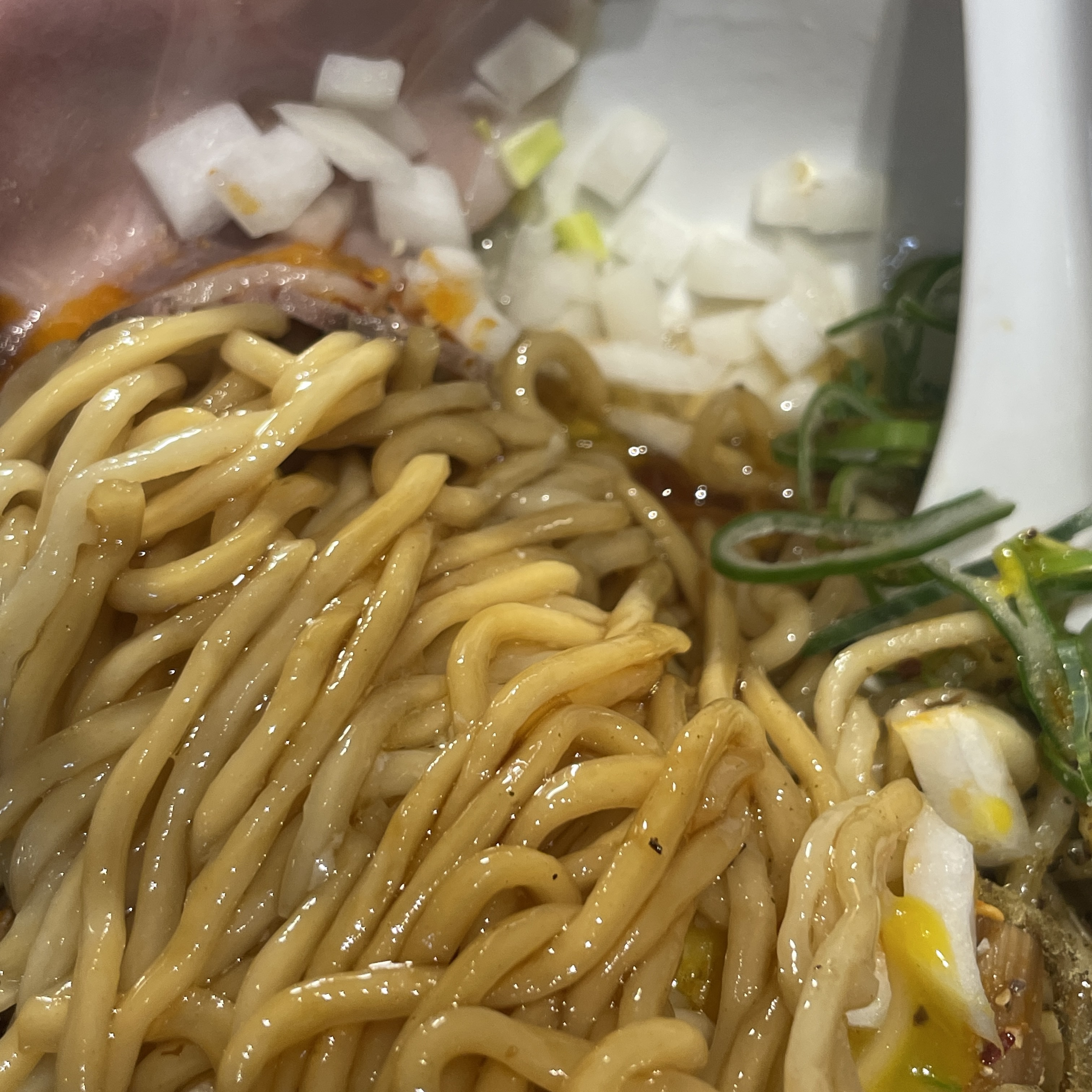 토핑으로는 훈연하지 않은 깔끔한 목살 차슈, 양파가 들어있어요