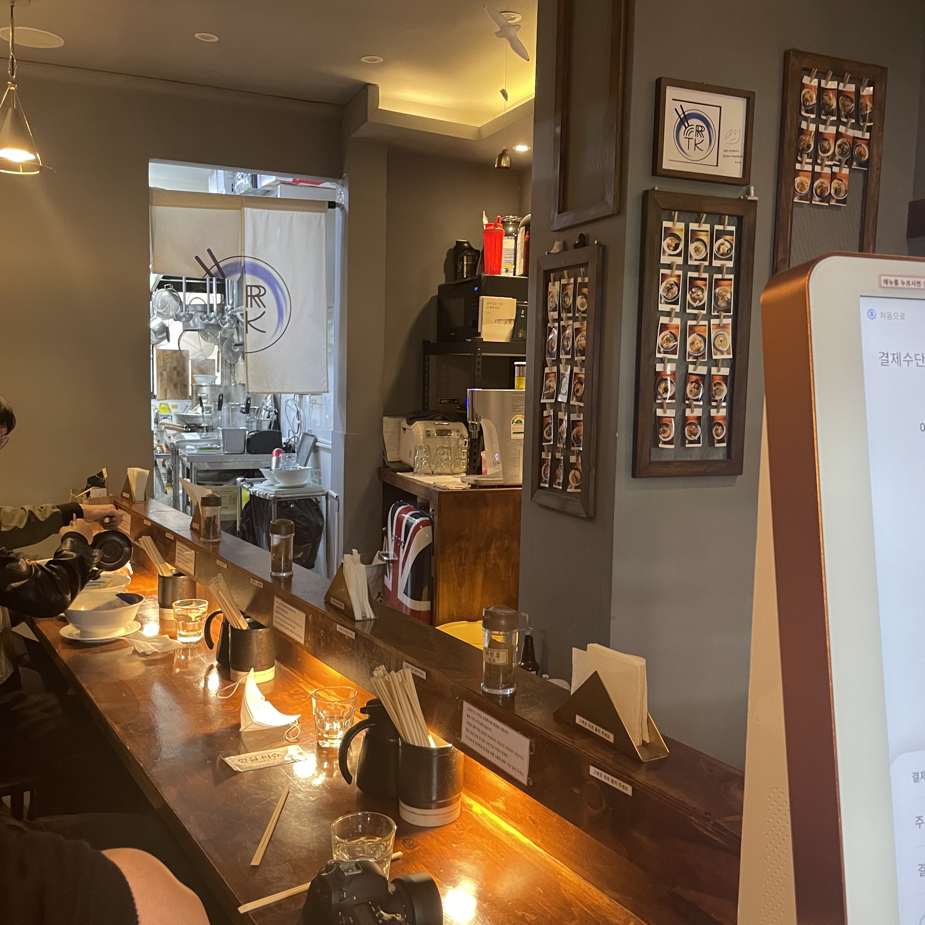 문을 열고 들어가면 바로 앞에 라멘을 주문할 수 있는 키오스크가 있고 2인 3팀정도 받을 수 있는 ㄱ자 형식의 테이블이 있어요