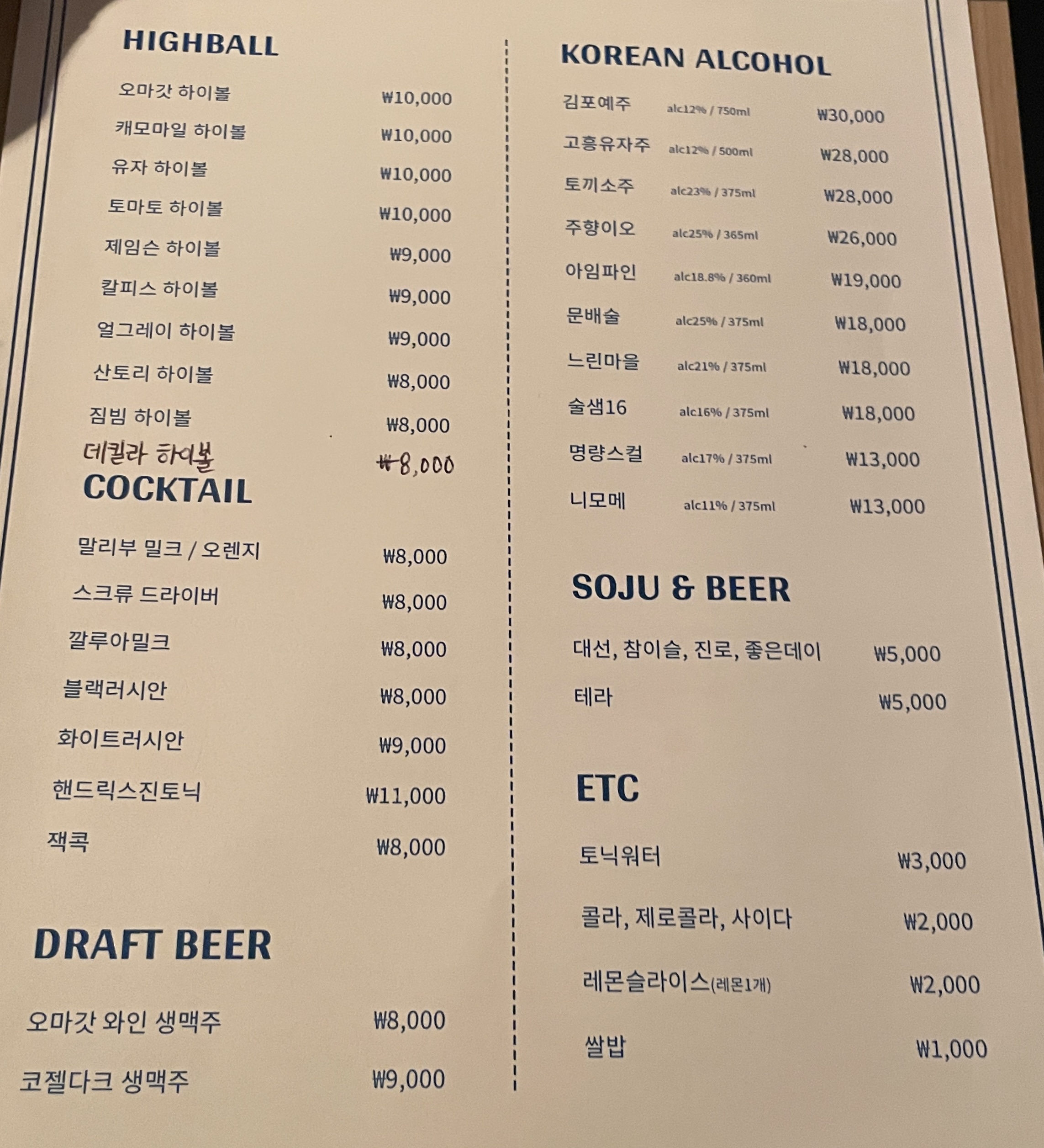 다음은 하이볼, 칵테일, 생맥주, 전통주, 소주 등 주류 종류입니다.