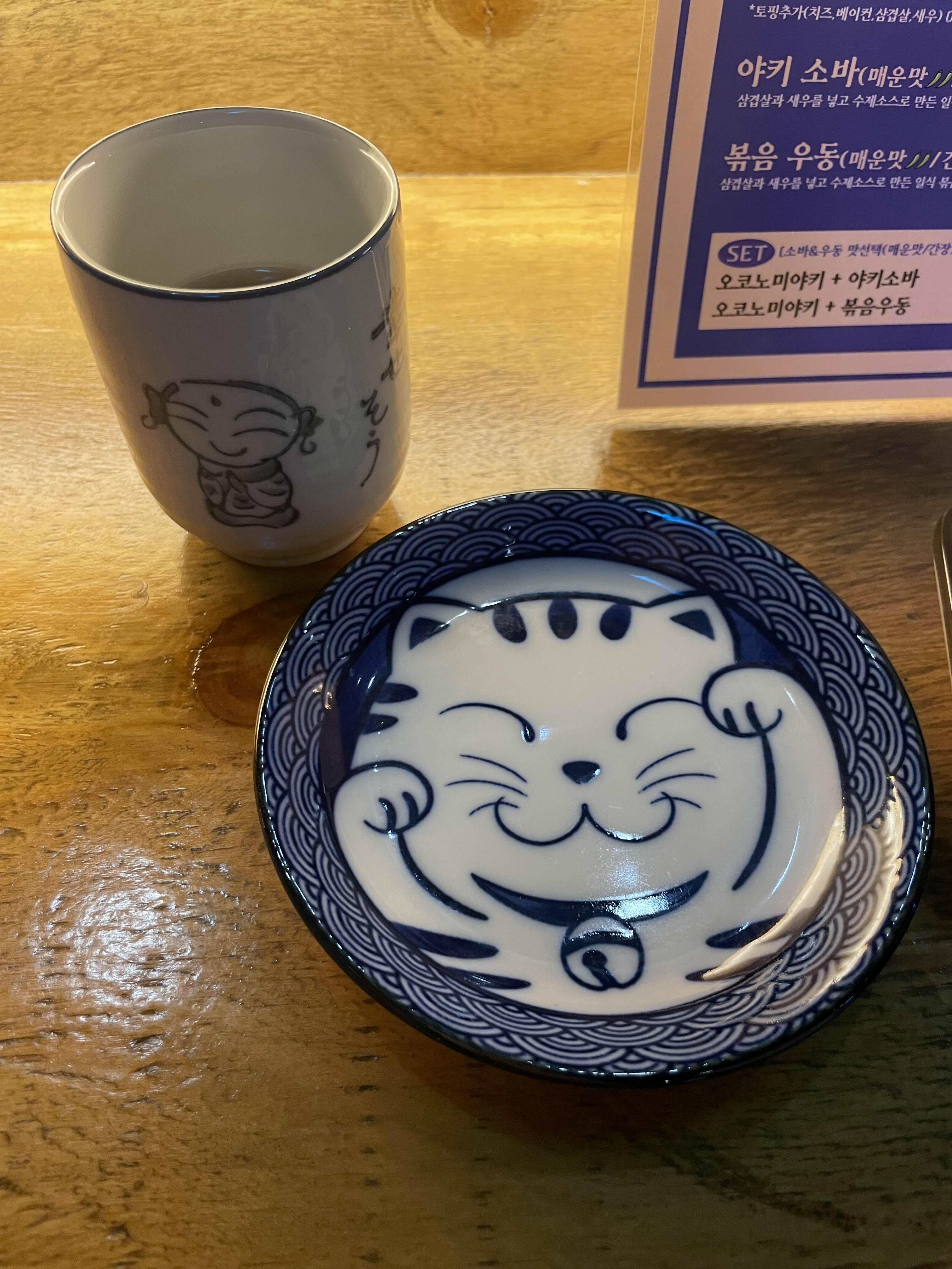 컵과 그릇에 일본 고양이 캐릭터가 그려져 있고 메뉴판 위에도 낚시하고 있는 고양이 피겨가 있어요