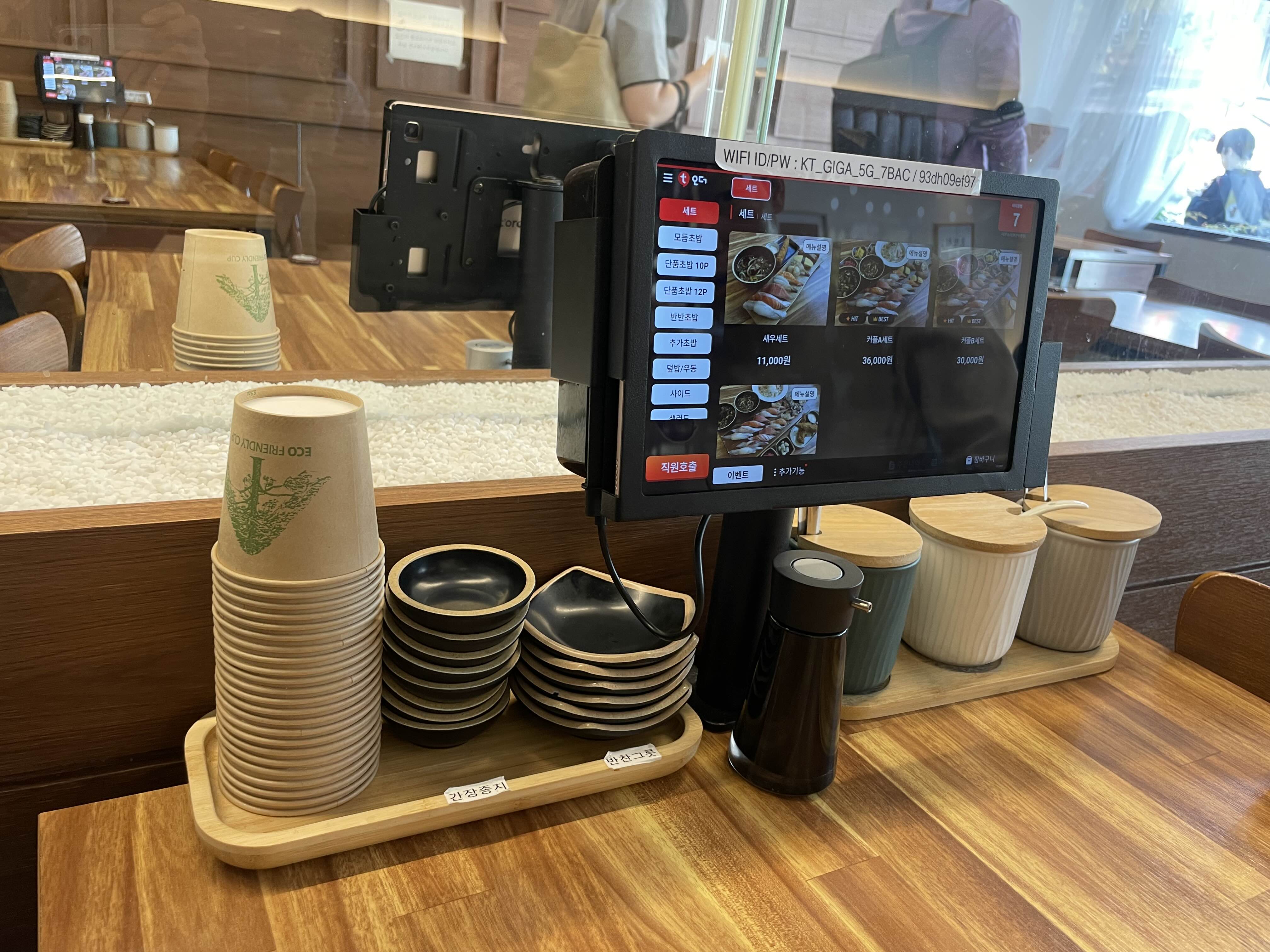 테이블 위에는 종이컵, 종지, 각종 밑반찬들, 주문할 수 있는 키오스크 태블릿피시가 놓여있어요